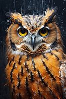 Uil Portret | Uil - Het portret toont een uil met indringende gele ogen, waarvan de verenkleed in warme bruintinten en oranje nuances een gevoel van diepte creëren. Het donkere, bijna zwarte achtergrond contrasteert sterk met het dier, terwijl witte spikkels het effect van neervallende sneeuw of regen suggereren.
