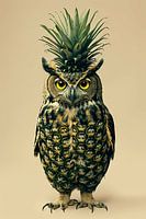 Dit surrealistische kunstwerk verbeeldt een fascinerende mix van een uil en een ananas. De uil heeft een imposante ananaskuif die zijn aanwezigheid benadrukt en het beeld een unieke en onconventionele charme geeft. De gele ogen van de uil en de stekelige textuur van de ananas creëren een opvallend contrast dat de aandacht trekt. Dit stuk is ideaal voor liefhebbers van surrealistische kunst en ongebruikelijke thema's die op zoek zijn naar een gedurfde en creatieve decoratie voor hun huis of kantoor.
