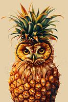 Dit surrealistische kunstwerk verbeeldt een fascinerende mix van een uil en een ananas. De uil heeft een imposante ananaskuif die zijn aanwezigheid benadrukt en het beeld een unieke en onconventionele charme geeft. De gele ogen van de uil en de stekelige textuur van de ananas creëren een opvallend contrast dat de aandacht trekt. Dit stuk is ideaal voor liefhebbers van surrealistische kunst en ongebruikelijke thema's die op zoek zijn naar een gedurfde en creatieve decoratie voor hun huis of kantoor.