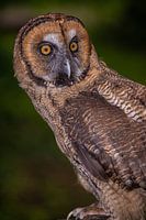 Mooie close up van een uil achterom kijkend met z'n mooie gele ogen met een vage achtergrond.