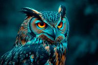 Met zijn doordringende, feloranje ogen staart de imposante oehoe alsof hij de bewaker van de nacht is. Zijn fascinerende verenkleed, gekenmerkt door gedurfde, zachte patronen, straalt majestueuze rust uit. De mysterieuze uitstraling en scherpe gelaatstrekken stralen kracht en wijsheid uit, terwijl de sombere achtergrond een vleugje mystiek toevoegt.