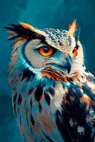 De uil kijkt majestueus naar de nacht met zijn feloranje ogen, alsof hij de geheimen van het bos bewaakt. De delicate maar opvallende veerstructuren lijken te dansen in het kleurenspel, terwijl de achtergrond in mysterieus blauw glinstert. Een wezen tussen werkelijkheid en magie, klaar om verhalen te vertellen.