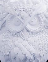 Een schilderij van een uil gegoten in gips zou een driedimensionaal kunstwerk kunnen zijn waarbij het beeld van een uil is gebeeldhouwd uit gips en vervolgens op een plat oppervlak is gemonteerd, zoals een canvas of een bord. Het gips zou kunnen worden geschilderd om de veren en details van de uil tot leven te brengen, terwijl de textuur van het gips een interessante visuele en tactiele dimensie toevoegt aan het kunstwerk.