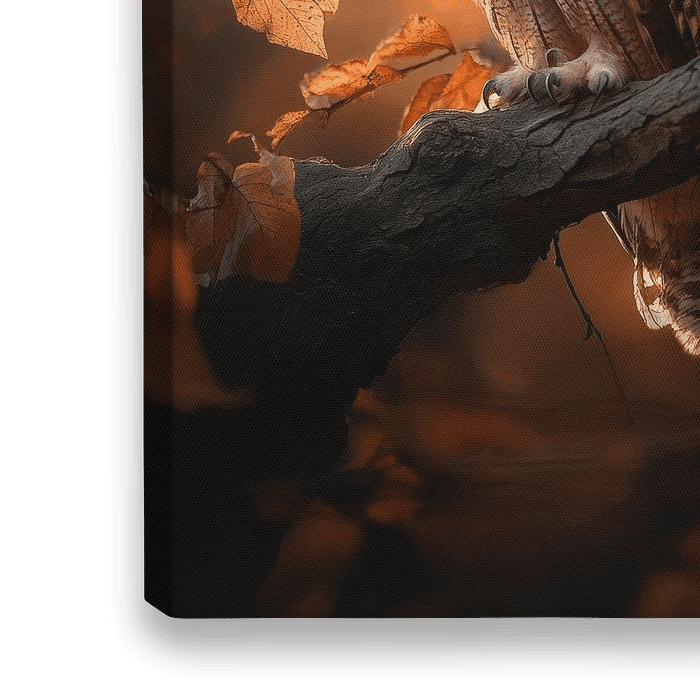 Met zachte, warme kleuren en de mysterieuze blik van een uil op een tak straalt dit kunstwerk rust en wijsheid uit. De herfstbladeren op de achtergrond geven het beeld een vleugje nostalgie. Ideaal voor een woonkamer die gezelligheid en een vleugje natuur wil uitstralen.
