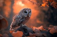 In een zacht, oranje licht zit een wijze uil op een tak omringd door heldere herfstbladeren. Zijn grote, expressieve ogen stralen rust en intelligentie uit. Dit betoverende kunstwerk brengt perfecte gezelligheid in de woonkamer en creëert een uitnodigende sfeer die uitnodigt om te blijven hangen.