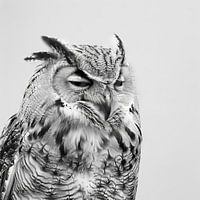 Deze foto toont een gedetailleerde close-up van een uil in zwart-wit. De textuur van zijn verenkleed en de expressieve ogen zijn fascinerend.