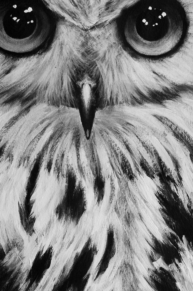 Een gedetailleerd, realistisch en handgeschilderd schilderij van een uil in zwart/wit. De uil heeft een zeer sterke en intrigerende blik.