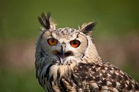 Portret van uil die recht in de camera kijkt. Mooie zachte achtergrond.