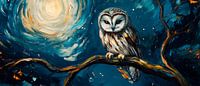 Stille majesteit omlijst door nachtelijk blauw: een uil met een doordringende blik zit zachtjes op een tak terwijl de maan helder aan de hemel staat. De harmonieuze kleuren en mysterieuze sfeer geven dit kunstwerk een stille elegantie - ideaal voor de slaapkamer of een gezellige leeshoek.