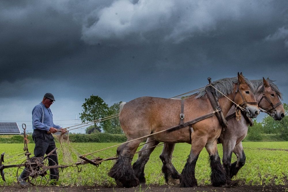 Je spant de paarden in de ploeg, en hoopt dat het droog blijft voordat je klaar bent.