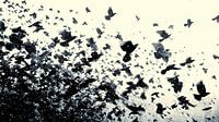 Een abstracte grafische voorstelling toont een zwerm kraaien en raven die vanuit een donkere hoek de heldere lucht in vliegen. De dynamische compositie vangt het moment waarop de zwarte vogels uit de duisternis opstijgen en naar de heldere hemel zweven. De vloeiende lijnen en vormen brengen een levendige beweging over en creëren een fascinerende dynamiek. Het spel van licht en schaduw benadrukt het contrast tussen de sombere hoek en de heldere lucht, waardoor het beeld een bijzondere intensiteit krijgt. De abstracte aard van de afbeelding nodigt de kijker uit om zijn eigen interpretaties te vinden van de opgang van duisternis naar licht. Dit kunstwerk vangt de magie van het moment waarop het zwart van de vogels de overgang markeert naar de helderheid van de lucht.