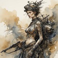 Een steampunk vrouw, met extreem mechanische uitstraling, komt uit een fantasie wereld. Met haar wapens en haar tatoeages heeft zij een grillige uitstraling. Het beeld is met behulp van ai gegenereerd.