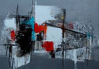 Abstracte afbeelding in grijs, wit, zwart, rood, gemengde media op doek, eigentijds, modern, grafisch, grijs, zwart, rood, grafisch