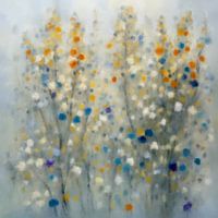 Zachte bloemen met kleurrijke stippen creëren een impressionistisch beeld. Zachte tinten blauw, geel, oranje en wit komen samen om een serene sfeer op te roepen.
