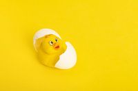 De geboorte van een rubber eendje, zo uit het ei tegen een gele achtergrond.