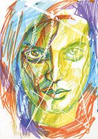 Tekening waarin is geëxperimenteerd met diverse kleurlagen over elkaar en uitsparingen door middel van sjablonen. Gezicht, portret.