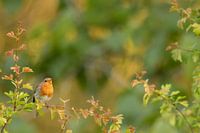 Roodborstje zingt uit volle borst op een meidoorntakje. Rustig beeld met mooie onscherpte in de achtergrond. Gefotografeerd in mijn tuin.