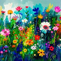 De gebruikte kleuren zijn warm zoals geel, oranje, rood, roze, paars voor de bloemen, die mooi contrasteren met de koelere tinten in de achtergrond.