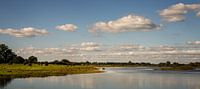 Vee graast aan de uiterwaarden van de IJssel in natuurgebied Vreugerijkerwaard bij Zwolle. Wolken weerspiegelen mooi in het water van de rivier.