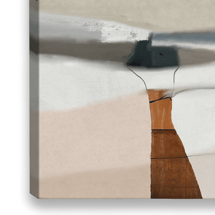 Abstracte compositie met een harmonieuze mix van gedempte kleuren. Het bestaat uit gelaagde vormen met zachte randen en overlappende gebieden in beige, crème, grijs en een vleugje oranje en zwart. De algehele compositie creëert een gevoel van evenwicht en rust door het gebruik van zachte, organische vormen en zachte, vloeiende lijnen.