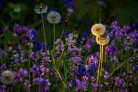 Uitgebloeide paardenbloemen tussen de wilde hyacinten in het Wildrijk in Sint Maartenszee, Noord-Holland tijdens zonsondergang.