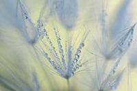 Uitgebloeide paardenbloem tijdens zonsopkomst met dauwdruppels. De frisse voorjaarsbloeiers zorgen voor een mooie achtergrondkleur. Genomen bij de Kraaijenberg te Bergen op Zoom in Nederland.