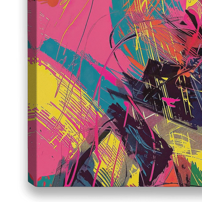 Details: abstract, moderne kunst, levendige kleuren, figuur, beweging, roze, geel,…