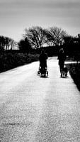 Twee dames, met kinderwagen en hond, wandelen in de felle herfstzon van november 2021. De zon was nog opmerkelijk warm en fel, en wierp harde schaduwen op straat.