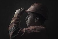 Koop dit portret Uitgeputte spoorwegarbeider ziet licht aan het eind van de tunnel van Besa Art als print op canvas, aluminium dibond, (ingelijste) fotoprint, behang en ArtFrame. Voor jou op maat geprint in Fine-Art kwaliteit.