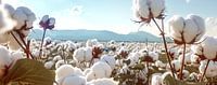 De voorgrond wordt gedomineerd door grote, pluizige katoenbollen die stevig aan de stelen vastzitten. De delicate textuur van de katoenplanten wordt prachtig vastgelegd, met subtiele schaduwen die de diepte en de…