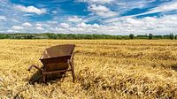 Aan de rand van een akker met stro staat een oude kruiwagen onder Zeeuwse zomerse luchten.