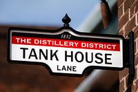 Uithangbord aan een stenen muur met tekst Tank House Lane uit de Distillery District in Toronto, Canada. Leuke afbeelding om op te hangen in een bar of café.