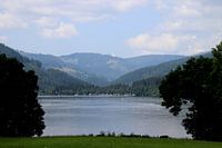 Uitzicht kijkend over de Titisee. Dankzij de bomen wordt het meer gekaderd met de bergen op de achtergrond.