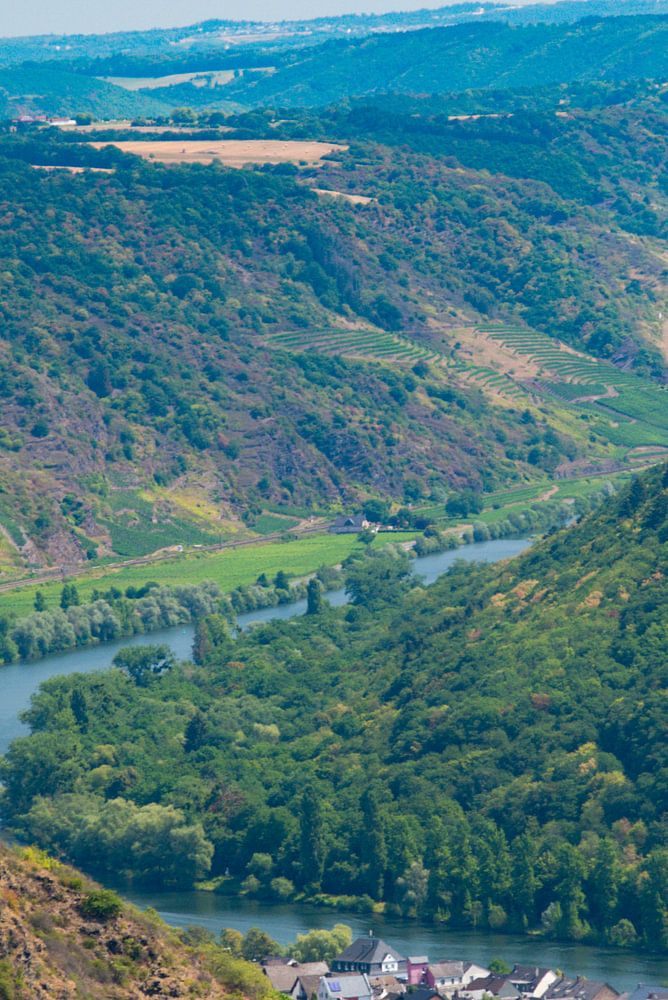 Vanuit een hoger punt kan je uitkijken over de moezel. Onderaan het schilderachtige stadje Cochem.