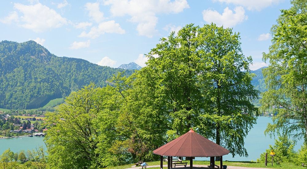 idyllisch lentelandschap upper bavaria, uitkijkpunt met gazebo, uitzicht op de Tegernsee en bergen