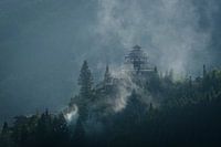 Uitkijktoren in Longji temidden van de rijstterrassen. Foto vroeg in de ochtend gemaakt met laaghangende bewolking.