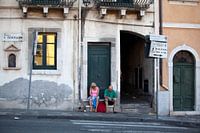 Deze foto is in 2014 genomen in Taormina, een badplaats in noordoost-Sicilië. De foto laat zien hoe het shoppen kan eindigen: moe, maar (hopelijk) voldaan wachten op de bus naar huis