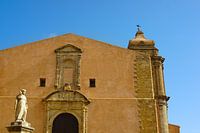 Uitsnede van een mooie zandstenen kerk in Erice, Sicilië. Het contrast tussen de lucht en de aardse tonen van de gevel wordt versterkt door het beeld ind e voorgrond.