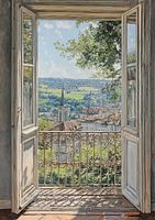 Uitzicht Balkon - In dit landschap schilderij zie je een prachtig uitzicht vanuit een open raam met een balkon, waar een groene heuvel en een torenspits zichtbaar zijn onder een blauwe lucht met enkele wolken.