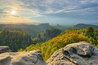 Uitzicht vanaf het Carolaaussicht in Saksisch Zwitserland op een middag in de vroege herfst. Een bui komt van rechts en bedekt al snel de zon.