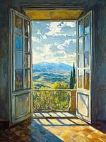 Uitzicht Landschap - Dit is een schilderij van een open raam met uitzicht op een prachtig landschap, waarbij de zonnestralen schaduwen en kleuraccenten op de vloer werpen en een bewolkte lucht boven de bergen zichtbaar is.