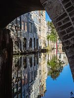 Op deze foto Kijk u onder de Gaardbrug door naar de Maartensbrug in het mooie oude centrum van Utrecht, De panden geven een prachtige weerspiegeling in het water. Je zou je bijna in Venetië wanen. Deze foto is genomen op een nazomerdag in september. De foto is gemaakt met een digitale camera waarbij ik gebruik heb gemaakt van een ouderwetse lens waarbij ikzelf moet scherpstellen, Oude lenzen doen vaak andere dingen met kleur en contrast,