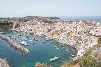 Op deze foto zie je het pastel kleurige eiland Procida voor de kust van Napels in Italië. Deze foto is gemaakt vanaf Panoramica Sulla Corricelle vanwaar je een prachtig uitzicht hebt over dit stuk van het eiland en het haventje.