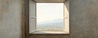 Uitzicht Schilderij | Raam Uitzicht - Op dit moderne landschapsschilderij zie je een open raam met een prachtig uitzicht over groene heuvels en een verafgelegen stad onder een heldere lucht.