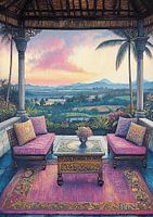 Uitzicht Veranda | Veranda Uitzicht - Op dit landschap schilderij zie je een prachtig uitzicht vanaf een open veranda met twee comfortabele zitplaatsen en een tafel, terwijl de lucht een mooie mengeling van kleuren toont bij zonsondergang, omringd door palmbomen en bergen in de verte.