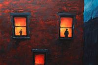 Twee silhouetfiguren schitteren in fascinerende roodtinten en staan achter ramen in een mysterieuze woonsfeer. De warmte van het licht contrasteert indrukwekkend met de duisternis van de avond. Dit kunstwerk creëert een melancholische stemming en is ideaal voor een woonkamer, waar het een gesprek kan stimuleren en emoties kan opwekken.
