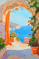 Een uitnodigend uitzicht door een pittoreske boog omringd door bloeiende planten, onthult de zachte golven van de zee en glooiende bergtoppen. De warme kleuren en het licht roepen een gevoel van vakantie en ontspanning op. Perfect voor de woonkamer om een sfeer van rust en welzijn te creëren.