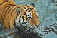 Uitzicht in de blauwe golven. Jonge mooie tijger met expressieve ogen loopt op het water (baden), Predator's snuit close-up.