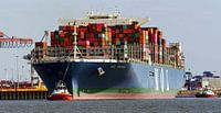 Fotografie, een containerschip dat de haven verlaat