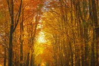 Landschap met beukenbomen met gouden bladeren in een bos tijdens een mooie herfstdag in natuurgebied de Veluwe in Gelderland.